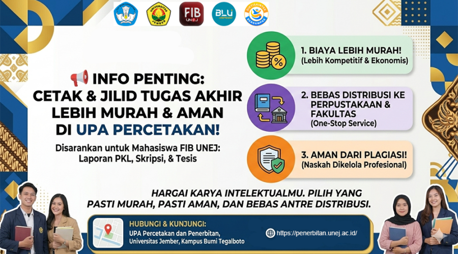 Halo, Rekan-rekan Mahasiswa Fakultas Ilmu Budaya Universitas Jember! Dalam rangka meningkatkan kualitas pelayanan serta menjamin perlindungan karya ilmiah mahasiswa, Pimpinan Fakultas Ilmu Budaya Universitas Jember menyarankan agar proses penjilidan, pencetakan, dan bendel dokumen Tugas Akhir (Laporan PKL, Skripsi, dan Tesis) dilakukan melalui UPA Percetakan dan Penerbitan Universitas Jember. Mengapa disarankan di UPA Percetakan? Berikut adalah 3 Keuntungan Utama yang akan kalian dapatkan: Biaya Lebih Terjangkau: Harga yang ditawarkan lebih kompetitif...Read More