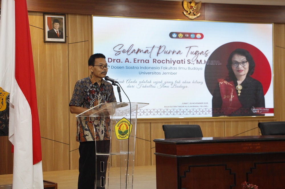 Fakultas Ilmu Budaya (FIB) Universitas Jember (UNEJ) hari ini resmi melepas salah satu dosen terbaiknya, Dra. A. Erna Rochiyati S, M.Hum., yang memasuki masa purnabakti per tanggal 1 Desember 2025. Acara pelepasan berlangsung hangat dan penuh haru, dihadiri oleh civitas akademika FIB UNEJ.